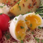 Вынимаем аккуратно шумовкой яйцо из воды, отрезаем ножом по краю лишние хлопья белка. Кладем яйцо в ледяную/очень холодную воду.