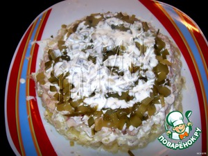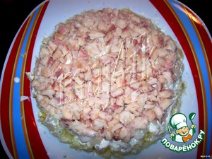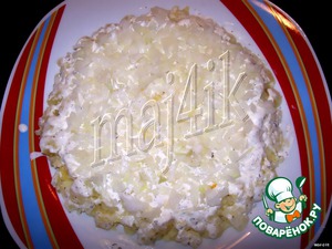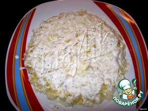 1-м слоем выложить картошку, промазать сметанно-майонезной смесью. -