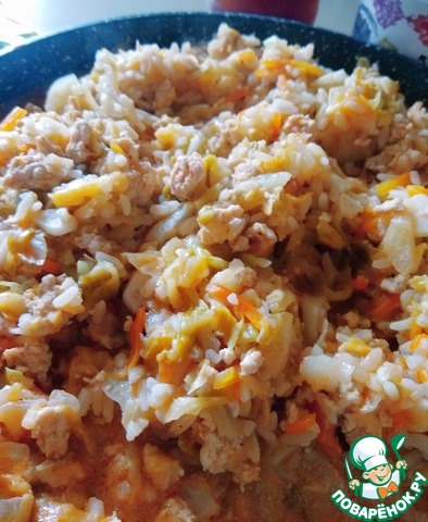 на режиме тушения за час приготовились нижние слои, те, что в воде. Верхний рис и капуста остались полусырыми. Перемешала и потушила еще