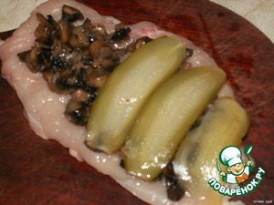 На столе выкладываем подготовленные грудки и распределяем на них грибы. Порезанные ломтики огурцов выкладываем на половину грудки.