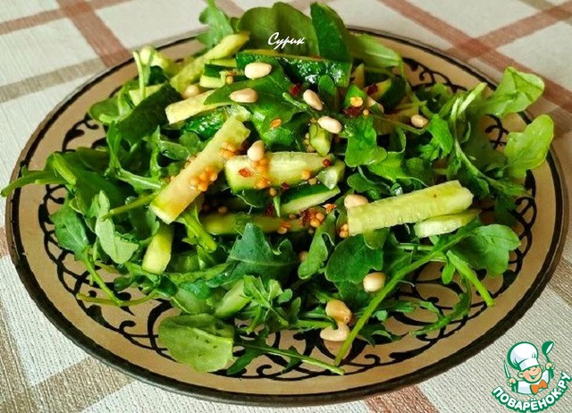 Поливаем салат заправкой, посыпаем кедровыми орехами.