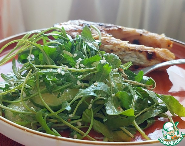 Огурец моем, режем полукольцами или соломкой. Перемешиваем с рукколой.