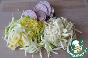 Овощи моем, чистим. Красный лук режем тонкими полукольцами, капусту белокочанную и пекинскую тонкими полосками.
