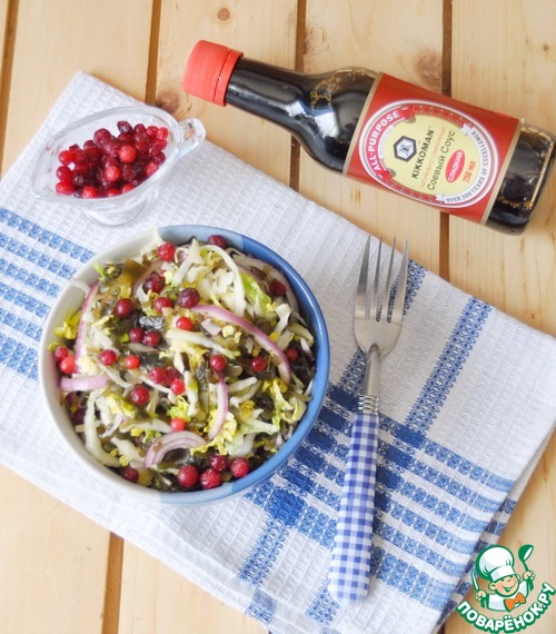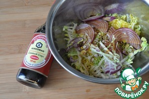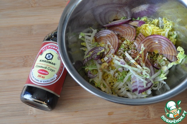 Капусту и лук слегка обминаем, сбрызгиваем уксусом и соевым соусом. У меня сладкий от ТМ Kikkoman.