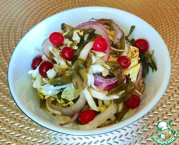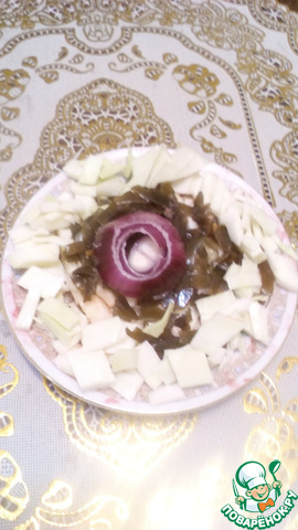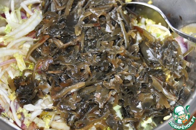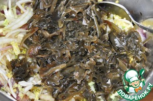Добавляем маринованную (у меня из банки) морскую капусту.