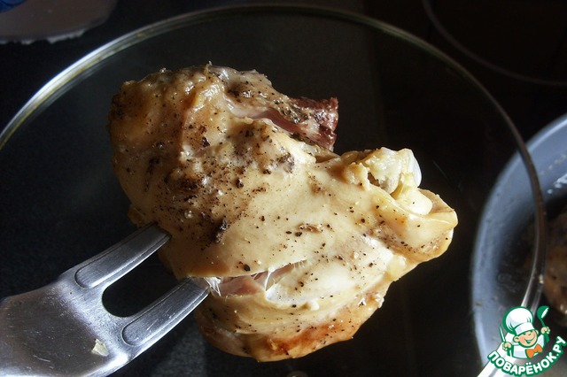 Вот, собственно и вся готовка. Курица получается очень мягкой. Благодаря долгому томлению, курица по нежности не уступает варёной.