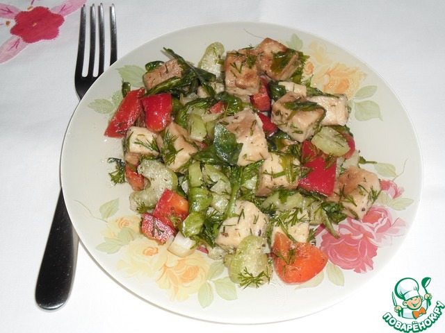 Теперь собираем салат: руккола, перец болгарский, сельдерей, все слои посыпаем зеленью, выкладываем горячий сыр и поливаем настоявшейся заливкой, если кому-то мало соли, добавляйте в процессе сборки, нам хватает соевого соуса. Вот и готов салатик, дольше описывать, чем готовить!