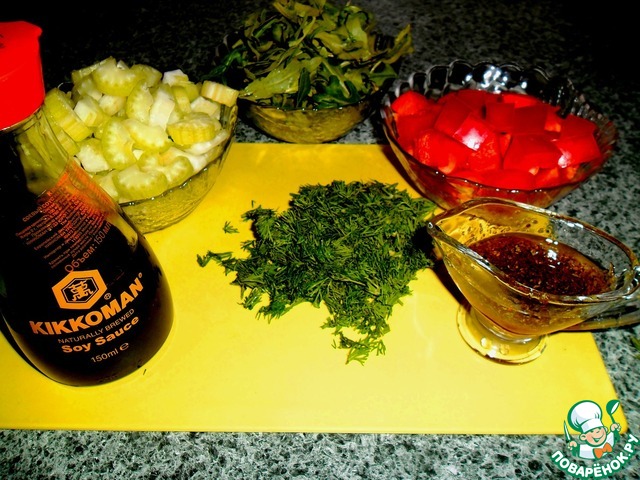 Помытые и очищенные сельдерей с перцем нарезать кубиками, у рукколы оборвать стебельки, зелень порубить, для заливки соединить масло растительное с лимонным соком, соевым соусом ТМ Kikkoman натуральный, черным перцем, перцем чили хлопьями + чеснок, сахар, пусть заливка настоится.