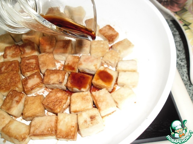 Полить соевым соусом ТМ Kikkoman, встряхнув сковороду распределить соус на все кусочки, прогреть 3-4 сек. чтобы соус впитался в сыр.