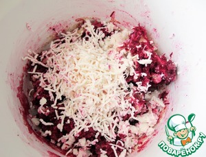 Натереть свеклу и сыр, смешать со специями и солью. Если вы берете Фету, можно посолить, брынза не требует дополнительной соли.