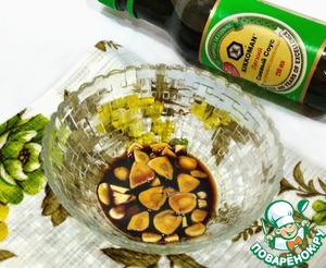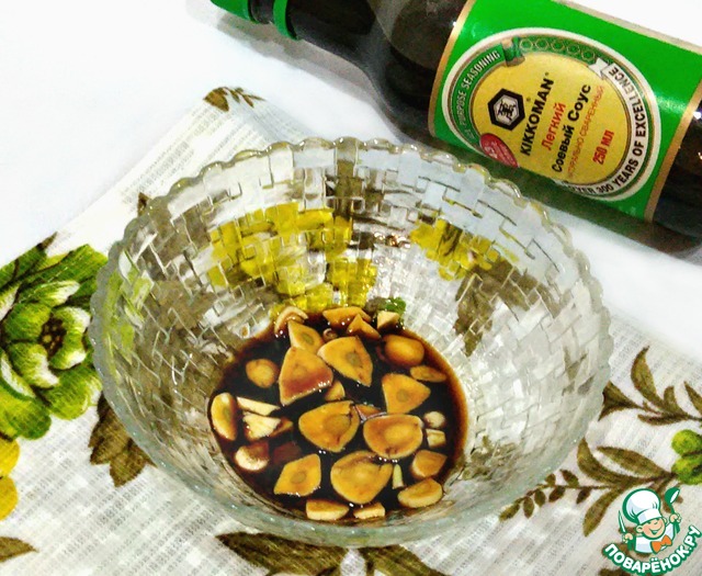 Чеснок порезать кружочками и залить соевым соусом. Я использовала натурально сваренный легкий соевый соус от ТМ Kikkoman.