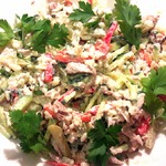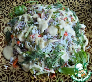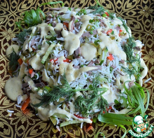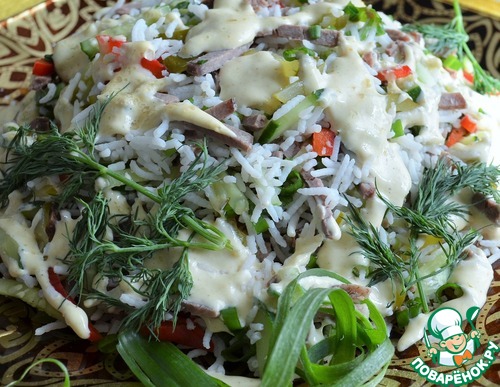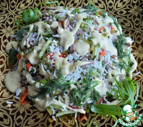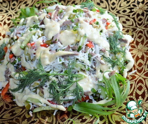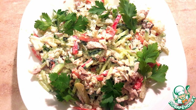 Очень яркий, сытный салатик. Не тяжелый совсем, т. к. вместо отварного картофеля я добавила вареный рис БАСМАТИ.