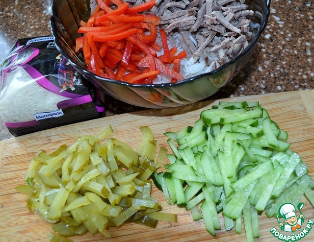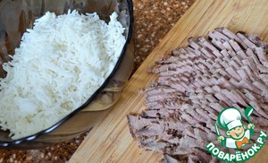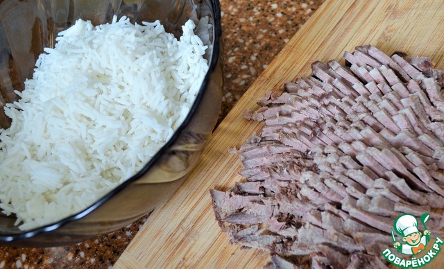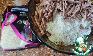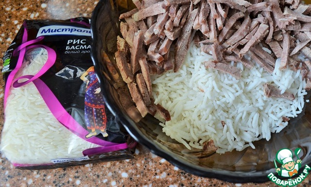 Нарезать говядину мелкой короткой соломкой, добавить к рису. -