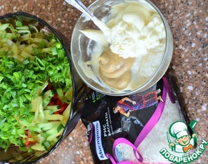 Отдельно приготовить заправку, смешав майонез, горчицу и хрен. -