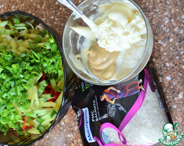 Я использую белый, ароматный рис БАСМАТИ от ТМ Мистраль, в салате он выглядит очень презентабельно. -