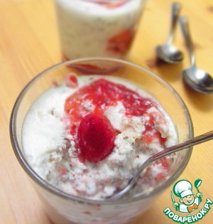 В креманку или широкие стаканы на дно положить ложку ягодного пюре, потом слой сливок с хлопьями. Чередовать слои. -