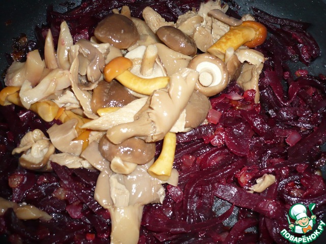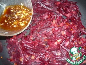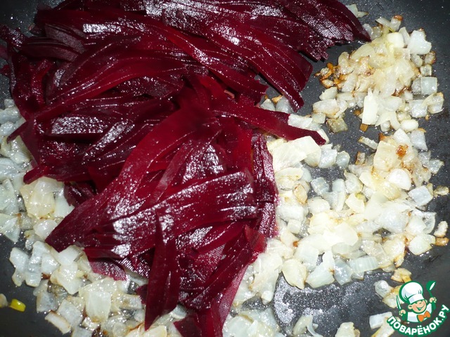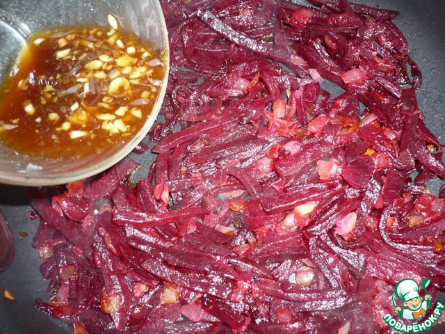 Делаем медленный огонь. Добавляем к обжаренному луку свеклу (нужно сварить заранее, почистить, нарезать тонкой соломкой). Помешивая, жарим 15 минут.