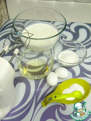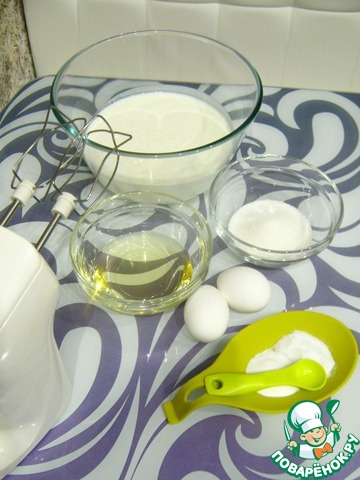 В глубокую ёмкость налить кефир, добавить сахар, соль, соду. Взбить. Добавить яйца и растительное масло.