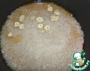 Слить воду с риса (рекомендуемое время 30 минут для замачивания в холодной воде), добавить в чашу мультиварки, разровнять ложкой, добавить нарезанный пластинами чеснок