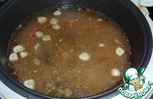 Мясо отделить от костей и нарезать кубиками. Покидать в чашу мультиварки.