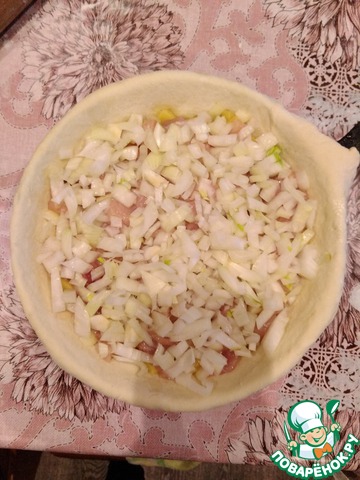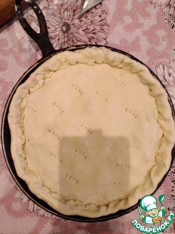 Начинаем собирать наш курник. для начала берем глубокую форму для запекания (у меня была глубокая чугунная сковорода). Ее смазываем подсолнечным маслом. Дальше наше тесто делим на две части одну часть делаем побольше другую оставляем маленькую так ка большая часть нам потребуется для основания нашего курника а другая послужит верхней частью что бы закрыть всю нашу начинку. Раскатываем большую нашу часть тесто по диаметру нашей формы что бы тесто немного свисало за борта формы. Далее выкладываем нашу картошку, после мясо и затем лук. Солим и перчим по вкусу. Раскатываем второй наш кусочек теста и накрываем им нашу начинку. по кругу защипываем тесто по всему кругу чтоб не где не было видно начинки.