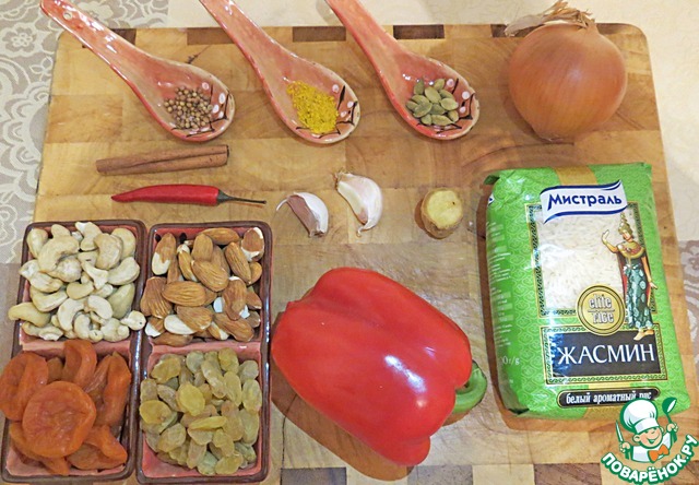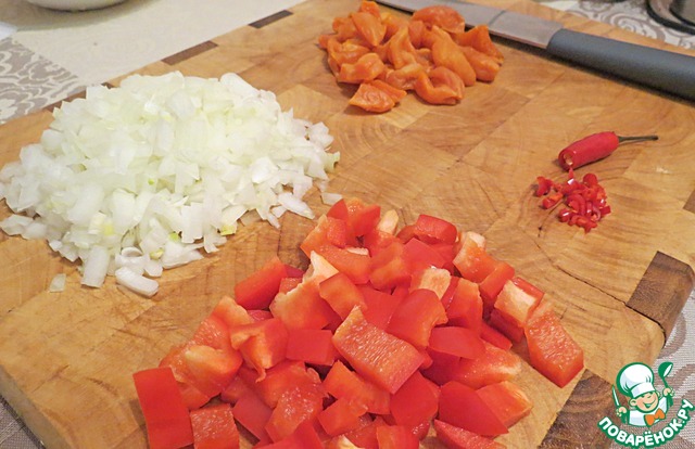 Лук мелко нарезать. Курагу промыть, обсушить и нарезать на 4 части. Изюм помыть и просушить. Перец болгарский порезать на небольшие кубики. Перец Чили нарезать мелко с семенами, но если необходимо уменьшить уровень остроты блюда можно очистить Чили от семян и положить только половину перца. Имбирь очистить от кожуры и мелко измельчить, можно на тёрке.