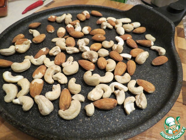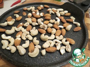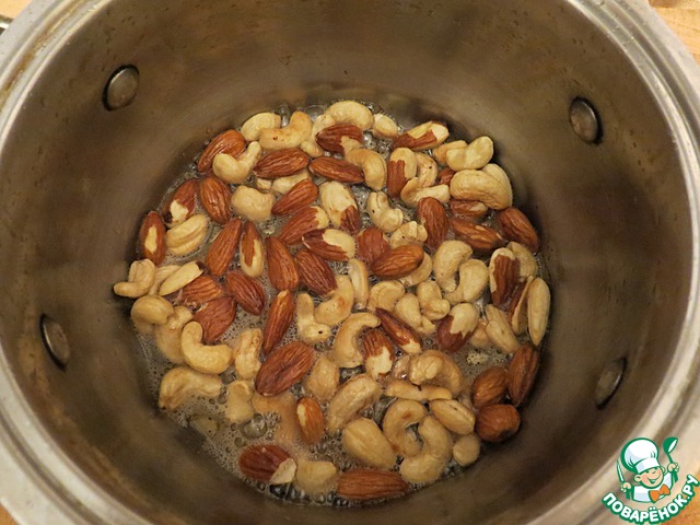 Растапливаем топленое масло на сковороде и добавляем подсолнечное. В хорошо прогретое масло выкладываем все орехи и жарим 1 минуту.