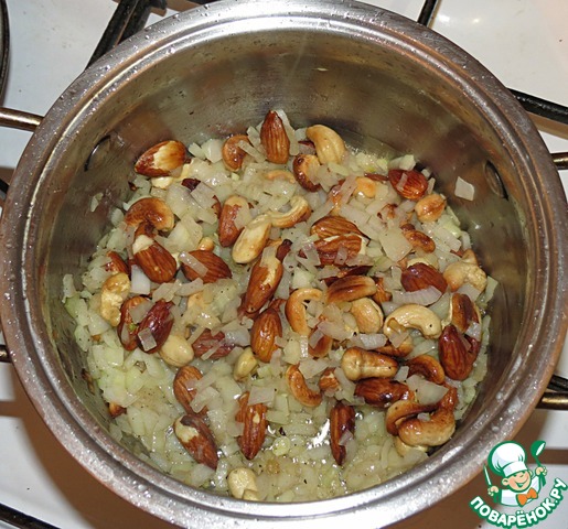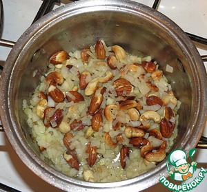 В сковороду с орехами добавляем лук и чеснок, жарим 2 минуты.