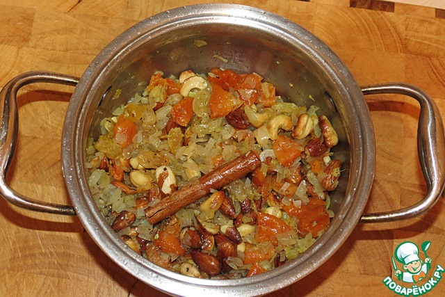 Добавить курагу, изюм, корицу, кардамон, кориандр, куркуму, имбирь. Помешивая, всё обжарить в течении минуты. Затем добавить болгарский и Чили перец. Все перемешать, подсолить и немного обжарить