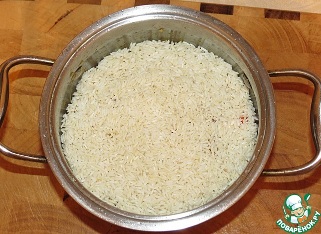 Сверху на обжаренные овощи и специи выложить ровным слоем рис. Аккуратно влить воду, чтобы покрыть полностью рис. Подсолите, дождитесь пока вода закипит. Накройте рис крышкой, уменьшите огонь и варите 8 минут. Перемешайте, снова накройте крышкой и дайте настояться минут 5-10.