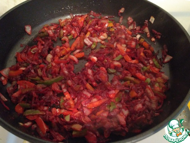 Время готовить заправку: в разогретую сковороду с растительным маслом отправляю лук и свеклу, обжариваю на среднем огне в течении 5 минут.