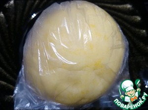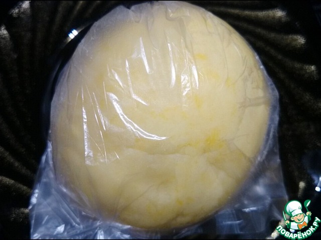 Добавляем желток, замешиваем пластичное тесто, скатываем его в шар, оборачиваем пищевой пленкой, а затем отправляем в холодильник на полчаса.