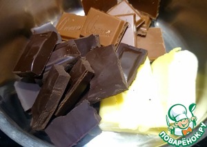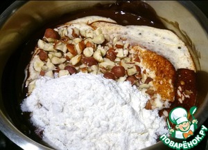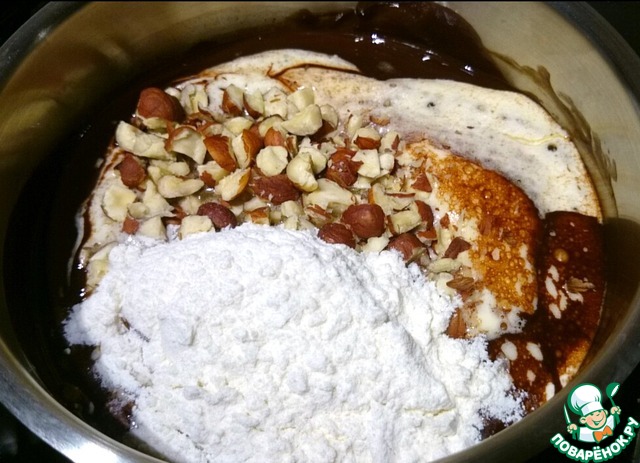 Добавляем в шоколад яично-сахарную смесь, ложку муки, измельченные орехи. Степень измельчения орехов можно регулировать: в оригинальном рецепте рекомендовалось измельчить орехи в мелкую крошку, я же оставила небольшие кусочки - мне так очень нравится! Компоненты тщательно перемешиваем, даем начинке немного постоять - загустеть.