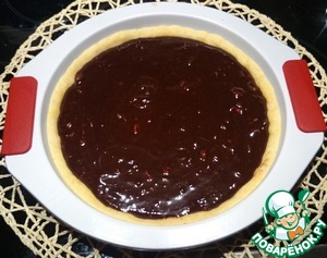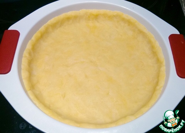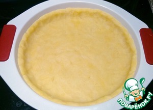 Достаем тесто из холодильника, распределяем по форме диаметром около 21 см, формируя невысокие бортики.