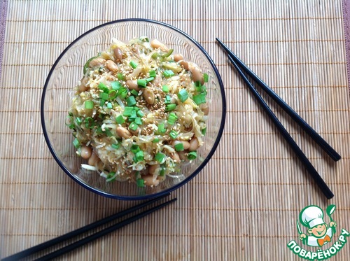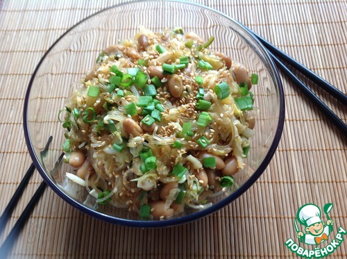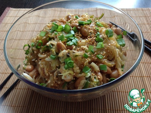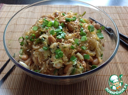 Фунчозу приготовить согласно инструкции. С фасоли слить жидкость, при необходимости промыть кипячёной водой.