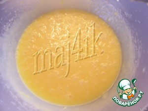 Растопленный маргарин хорошенько растереть с сахаром и ванильным сахаром.