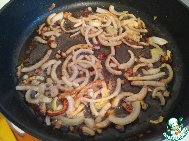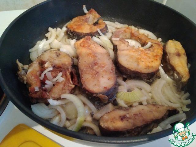 Приготовившуюся рыбу вынимаю, а лук еще немного обжариваю до мягкости и выкладываю к рыбе.
