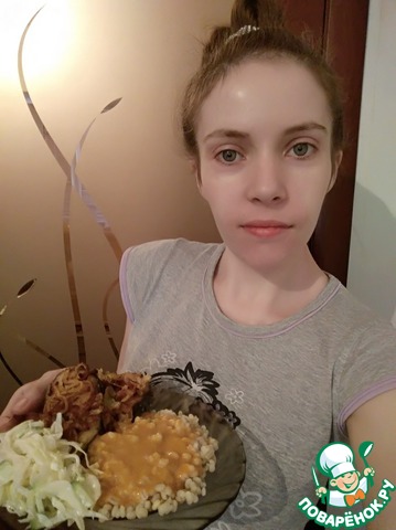 На тарелку выкладываем перловку, рыбу, лук и поливаем соусом. Подаю блюдо с салатом из белокочанной капусты со сметаной! Приятного аппетита!!!