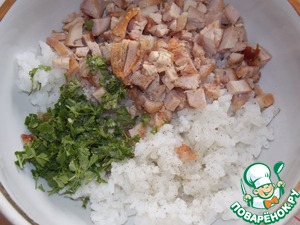 Куриное мясо (у меня жареное), мелко нарезать, смешать с отварным рисом и нарезанной зеленью. Посолить и поперчить. Перемешать. Начинка готова.