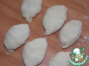 Тесто тонко раскатать (чуть толще чем на пельмени), вырезать кружочки, на середину выложить начинку и сформовать пирожки.
