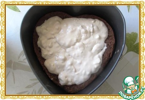 Первый пласт укладываем обратно в форму. С помощью кисточки пропитываем корж сладким кофе.