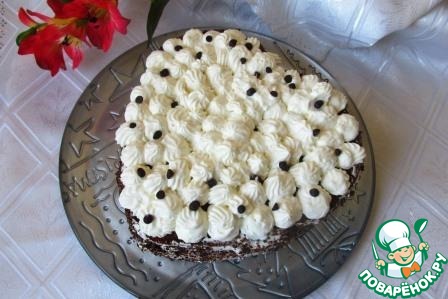 Остальные сливки помещаем в кондитерский мешок с насадкой "звездочка" и отсаживаем крем по поверхности торта. По краям я разбросала шоколадные капли. По рецепту из книги нужно было украсить кофейными зернами, но мне как-то не нравится во время поедания торта их отплёвывать, да и грызть их не особо... -