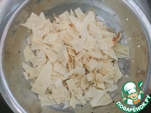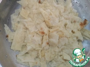 ... и обдаю кипятком. Вот такой вареный лаваш выходит. Перекладываю его в ёмкость для перемешивания всех ингредиентов.