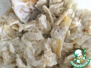 Теперь смешиваю порезанные лаваш и листы лазаньи со сметаной. Не удержалась и попробовала то, что перемешиваю - на вкус это как клецки в сметане... уже можно съесть. Но продолжу:
