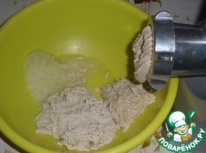 • Пропускаем через мясорубку лук, отварную рыбу и овсяные хлопья.