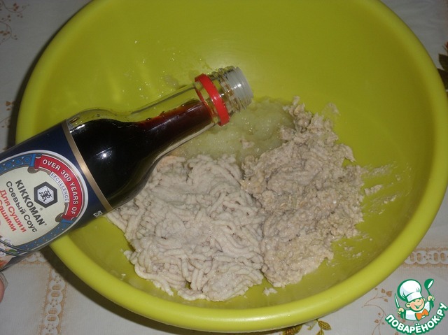 • В чашку к измельченным продуктам добавляем соевый соус ТМ "Kikkoman". По вкусу можно добавить молотый перец или смесь перцев.