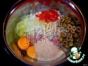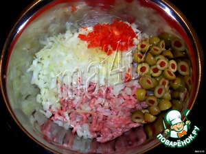 Добавить переполовиненные оливки и пропущенный через пресс чеснок. -