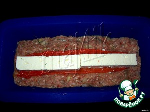Посерединке вдоль придавить фарш, делая тем самым что-то вроде канавки.