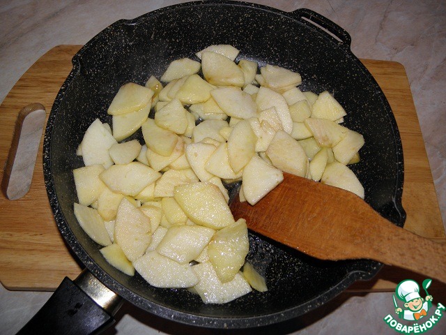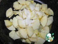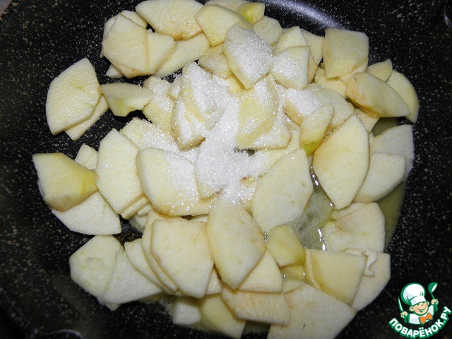 Яблоки очистить, нарезать дольками, в сковороде разогреть сливочное масло, обжарить яблоки с 1ст. л сахара, минуты по 4 каждая сторона |