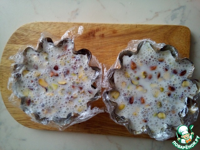 • Готовый желатин выливаем в сметану и добавляем измельченные фисташки.